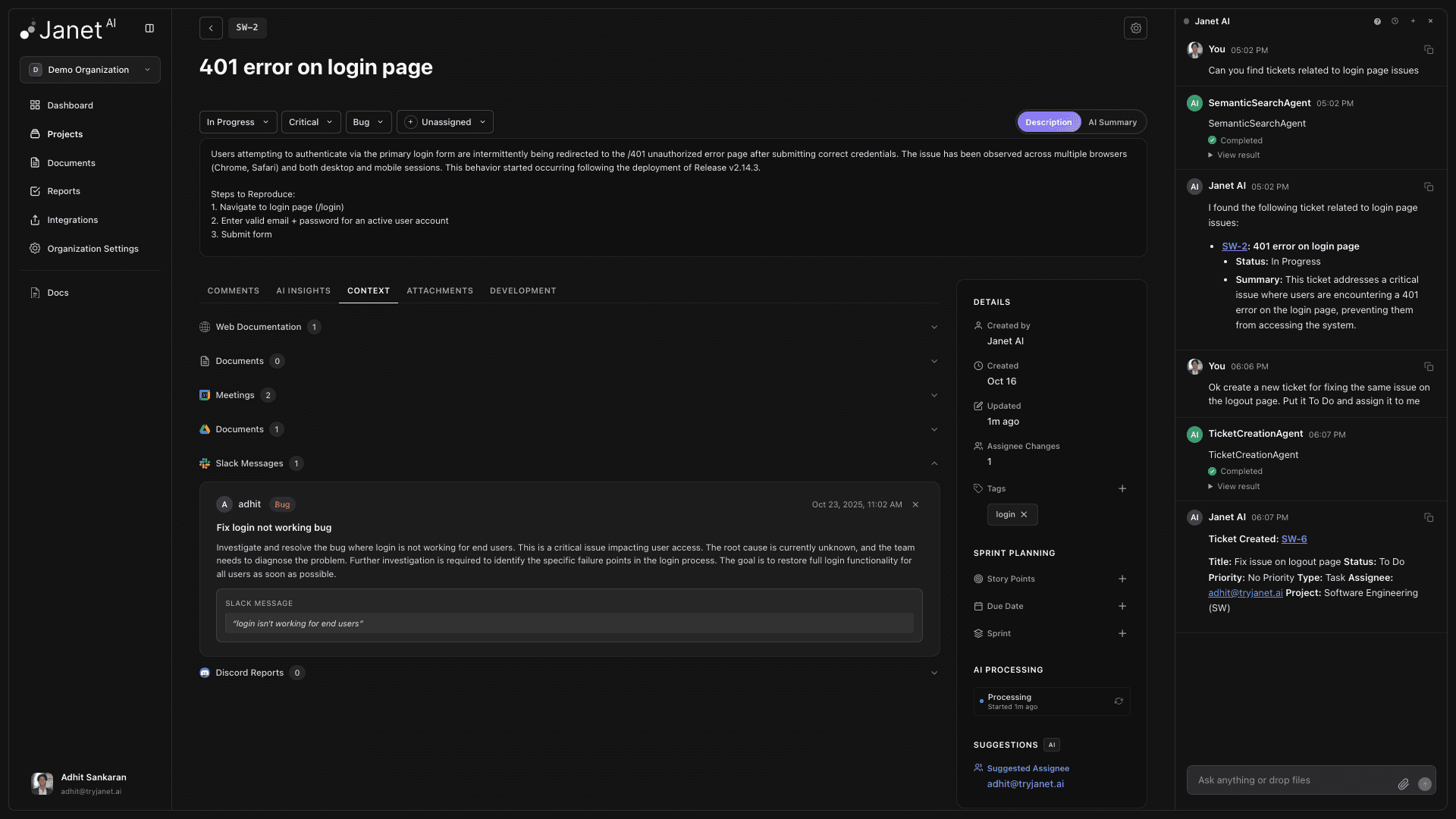 Automatically create, update, and route tickets as your team members or customers have ideas. Janet AI integrates with your team’s meetings, documents, Slack, Discord, and SMS to capture work items from internal and external communication channels.