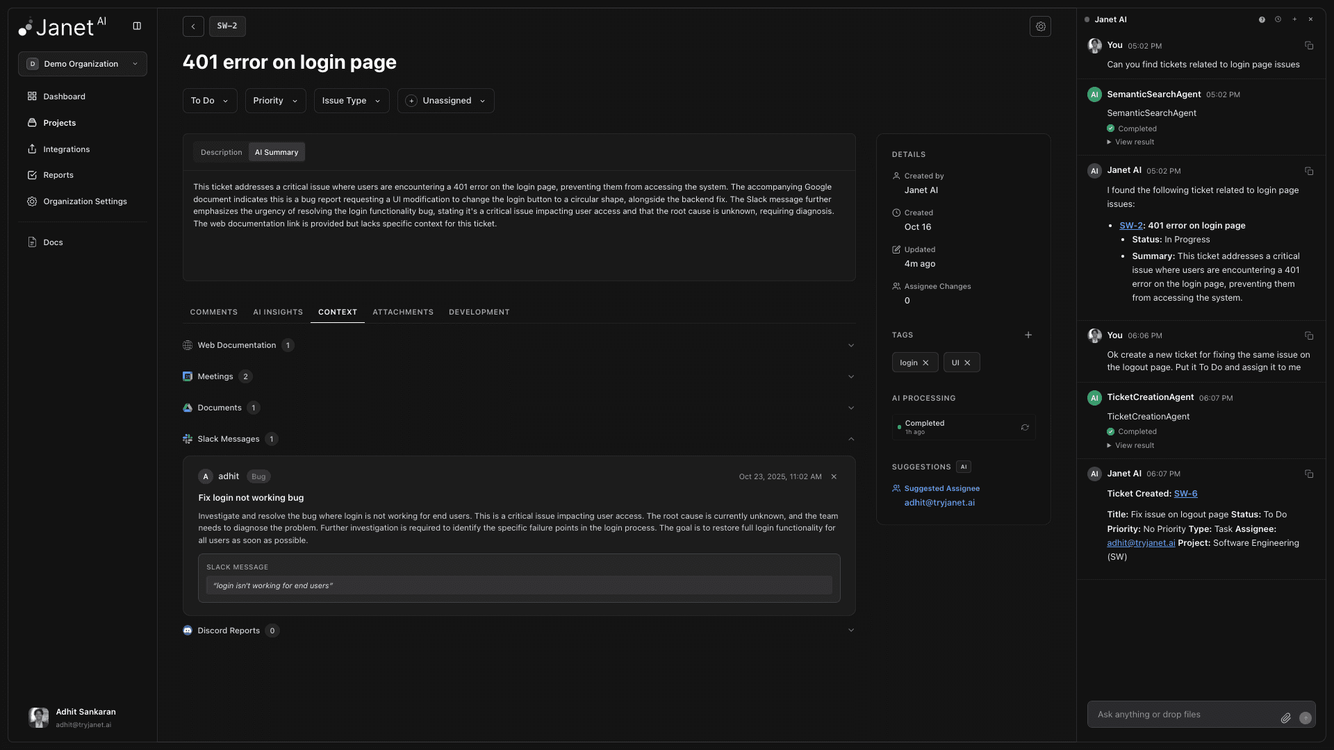 Janet AI automatically creates, updates, and organizes your issues.